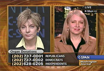 (C-SPAN) Commentator and guests talked about MatchingDonors.com and organ donations and Dr. Satel’s kidney transplant from her friend Virginia Postrel. They also wrote about their experiences in the October 25, 2006, issue of USA Today. They also responded to telephone calls and electronic mail. Sally Satel spoke by video link from Denver. Virginia Postrel spoke by video link from Los Angeles.