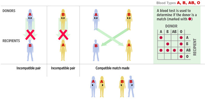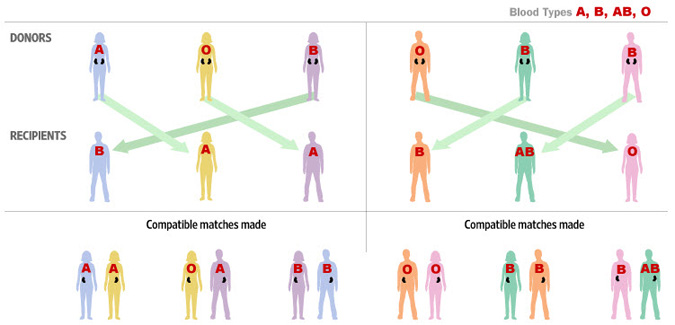 People with kidney failure who have a willing donor (friend, family member etc…) whose blood type is not compatible may be able to take part in a Paired Kidney Exchange Program. How it works is, if a donor and patient can be found who have the opposite blood type incompatibility, kidneys can be exchanged between the two pairs and two compatible live donor transplants are possible. Using MatchingDonors.com to find a direct altruistic donor is usually the easiest way to find a donor, but we want you to have as many options as possible to find your match so we are now also offering, at no additional charge, our paired exchange program where you can also search for a suitable exchange pair.